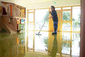 Los geht's! Mit viel Wasser und Reinigungsmittel werden die Fußböden der Kita eingeweicht.