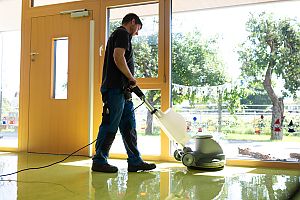 Glatte, harte Böden werden mit der Scheuersaugmaschine fachgerecht und effizient gereinigt.