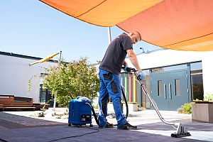 Wir fahren schwere Geschütze auf! Mit der Scheuersaugmaschine wird Schmutz gelöst und gleichzeitig eingesaugt.