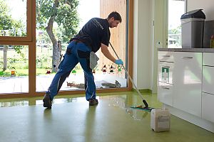 Nach der gründlichen Reinigung der Böden wird das Linoleum erneut beschichtet.